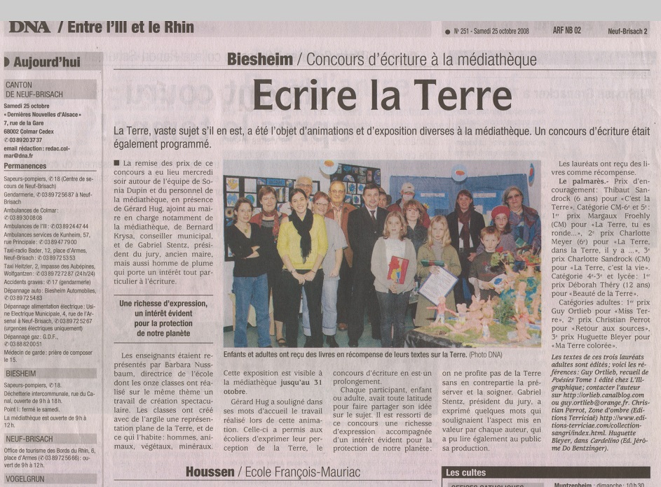 Parmi ces concours, certains ne se sont pas terminés par des publications, ne laissant derrière eux que la joie d’avoir vu son texte retenu et présenté aux lecteurs présents. Je citerai ce concours d’écriture à la Médiathèque de Biesheim où l’ambiance était si agréable que le souvenir m’en ait resté.